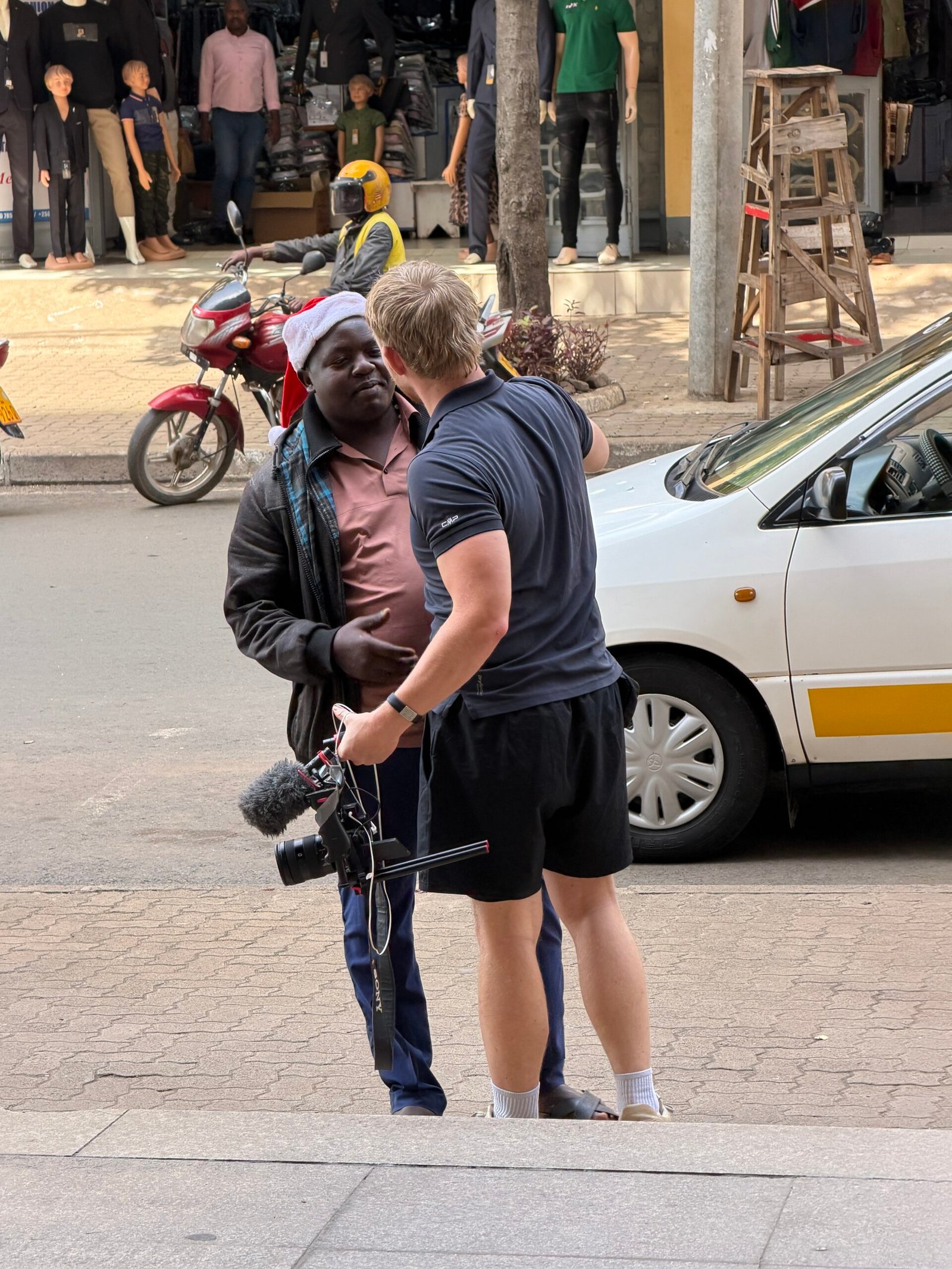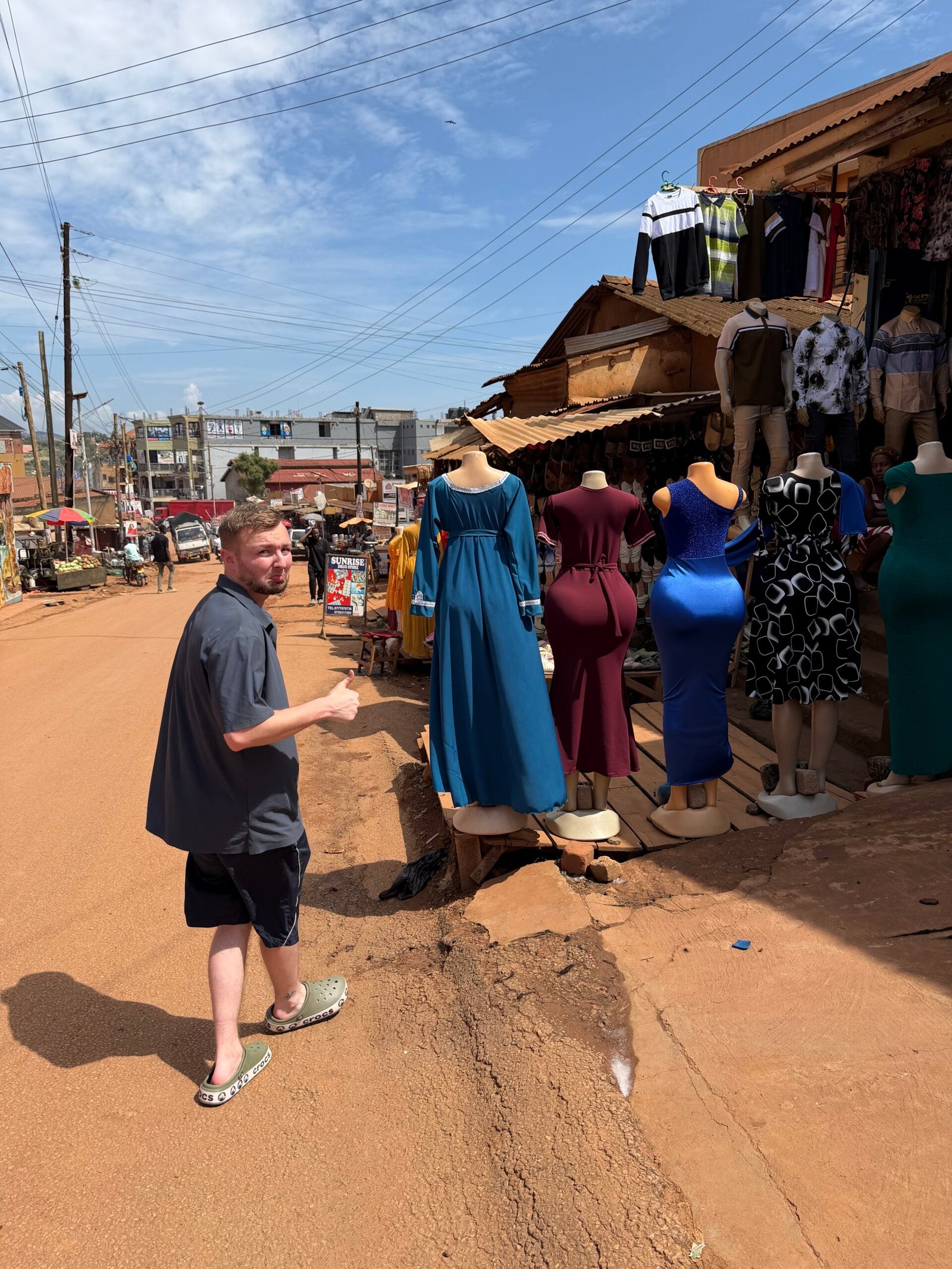 Vi har efterhånden lært at være omstillingsparate. Humøret blev holdt højt, og vi gjorde brug af den chauffør, vi havde hyret til vores kameramand. De første dage tilbragte vi i og omkring hovedstaden Kampala. Første opgave var at finde tøj, da vi kun havde det, vi stod i. Vi blev kørt til lokale markeder og markedsgader, og allerede her ramte stemningen os som et sansebombardement. Larmende, levende og kaotisk. Hænder trak i os fra alle sider, stemmer talte i munden på hinanden, og vi faldt i snak med de lokale sælgere.