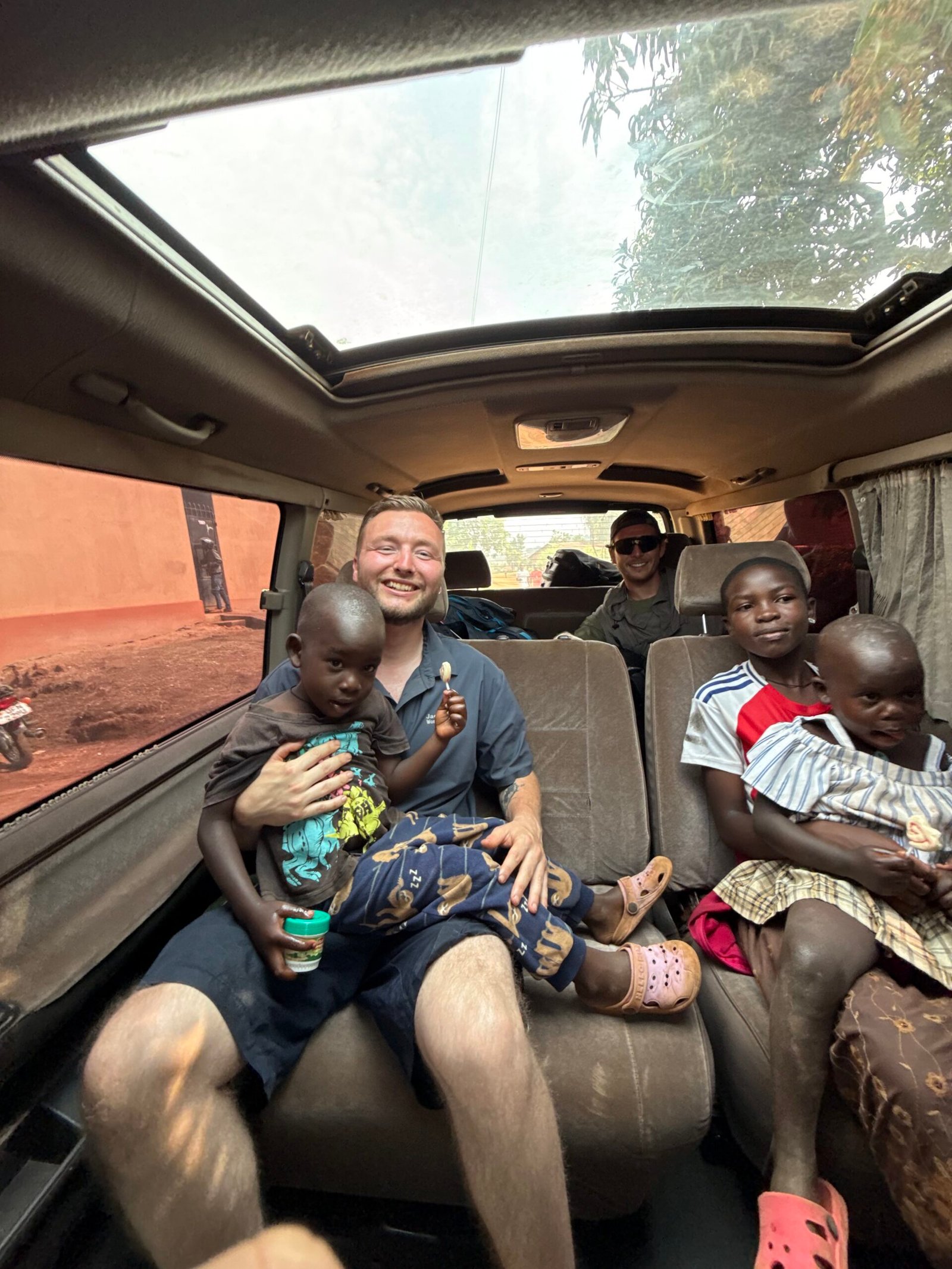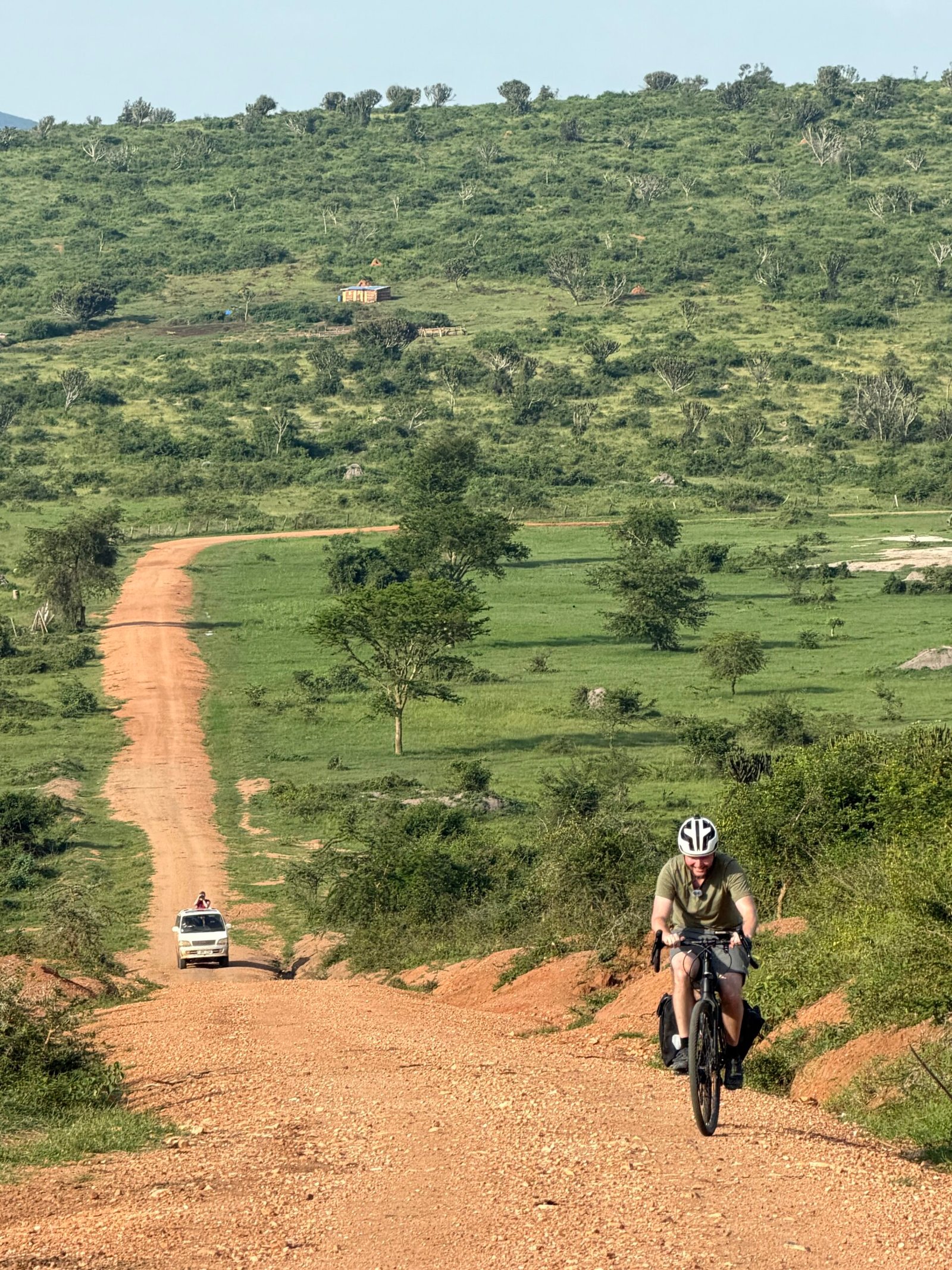 Efter fem dages venten ankom cyklerne endelig. De blev samlet, og vi kunne fortsætte. I mellemtiden var vi blevet tætte med vores chauffør Herbert. Han havde ikke set sine børn i fire måneder, fordi han ikke havde haft råd til at besøge dem uden at medbringe gaver. Vi gjorde stop i hans landsby nær Masaka og købte basale fornødenheder. Mødet var stille og ydmygt. Børnene bukkede, bar tingene ind og viste os deres hjem med stolthed. Alt de spiste, kom fra haven. Herbert gentog igen og igen, hvor glad han var.